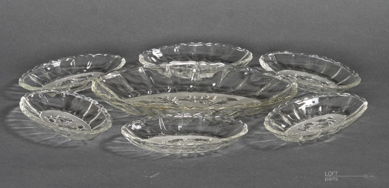 Komplet 6+1 bezbarwnych paterek śledziówek ''Osty'' wyprodukowanych w Hucie Szkła Gospodarczego Ząbkowice. W katalogu huty noszą numer 1279.