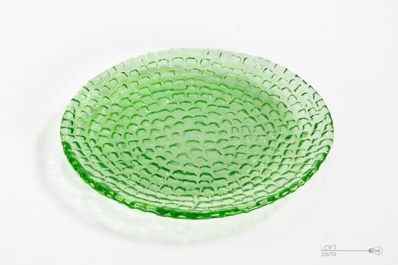 Zielony talerzyk ''Bruk'' zaprojektowany przez Ryszarda Serwickiego. Wyprodukowany w Hucie Szkła Gospodarczego Ząbkowice.
